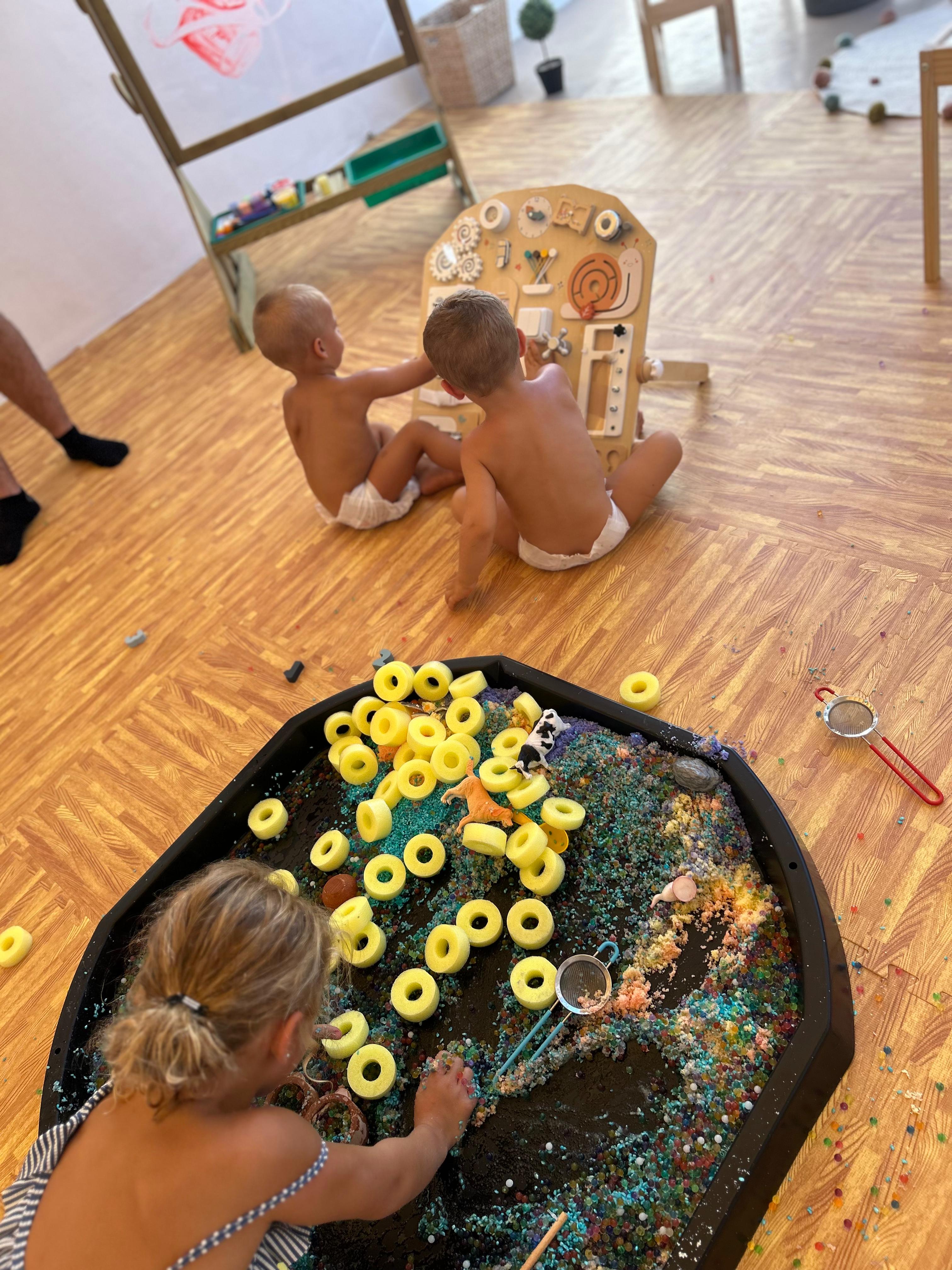 Llevamos propuestas de juego sensorial a escuelas infantiles y centros maternales. Cada actividad está basada en pedagogías activas como Montessori y Pikler, y adaptada al desarrollo evolutivo de cada etapa.